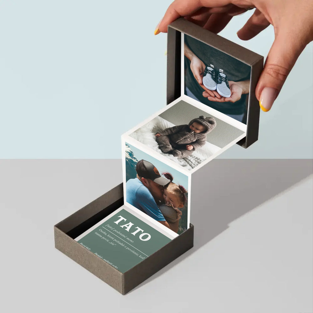 Harmonika sa skladá z troch fotografií s rozmermi 6,68 x 6,68 cm a personalizovanej karty s venovaním obdarovanej osobe.