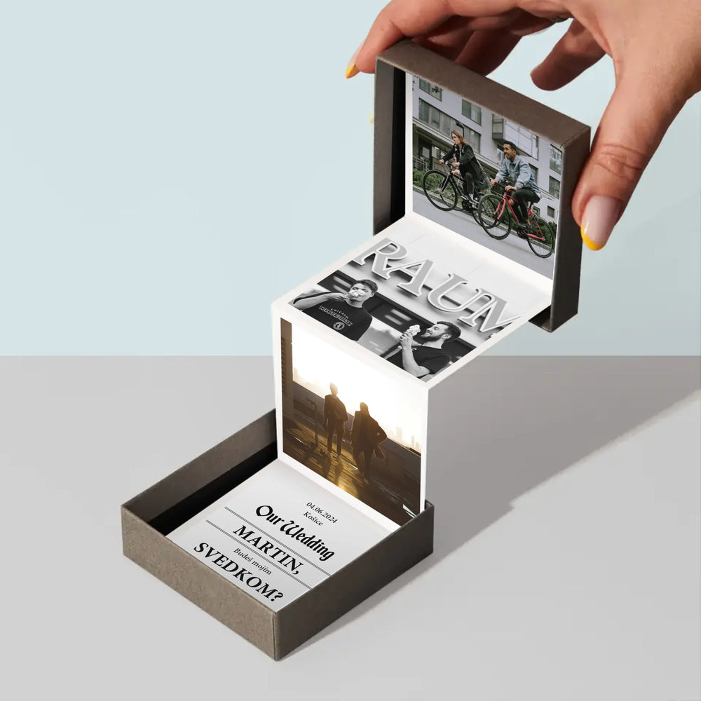 Pre Vás pripravenú harmoniku vlepíme do darčekovej krabičky s rozmermi 86 x 86 x 26 mm.