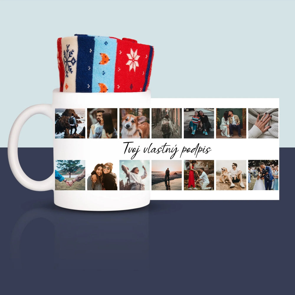 Fotokoláž: 14 Fotografií - Zimné ponožky v hrnčeku