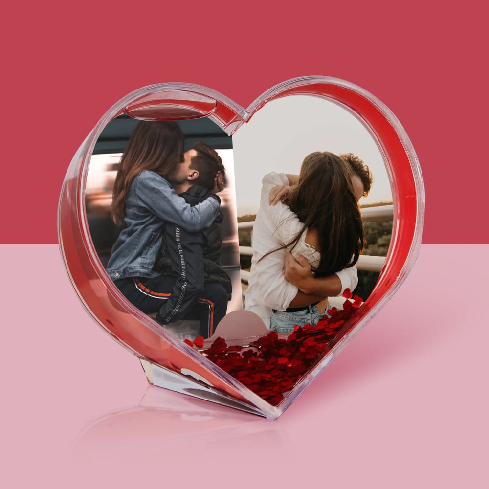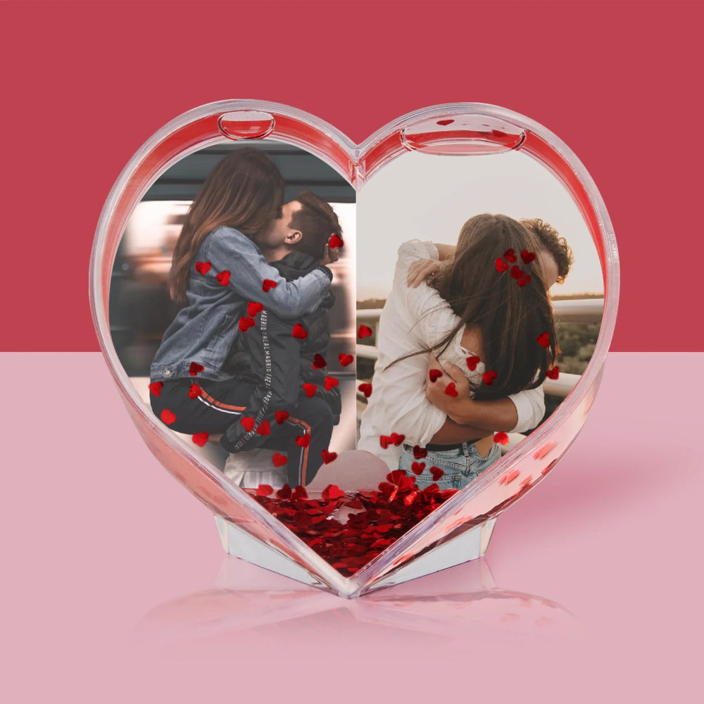 Vodná guľa s motívom víriacich snehových vločiek v tvare srdca a personalizovanou potlačou vo vnútri.