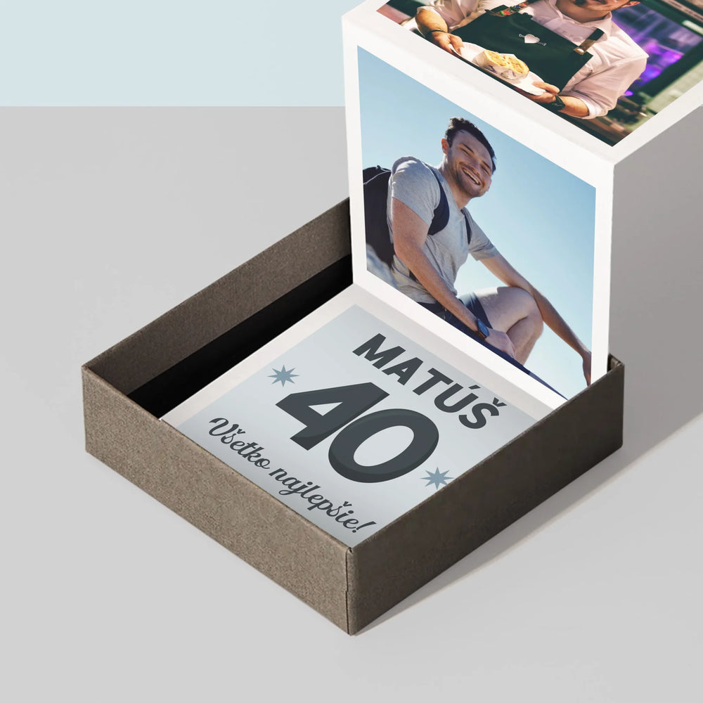 Harmonika sa skladá z troch fotografií s rozmermi 6,68 x 6,68 cm a personalizovanej karty s venovaním obdarovanej osobe.