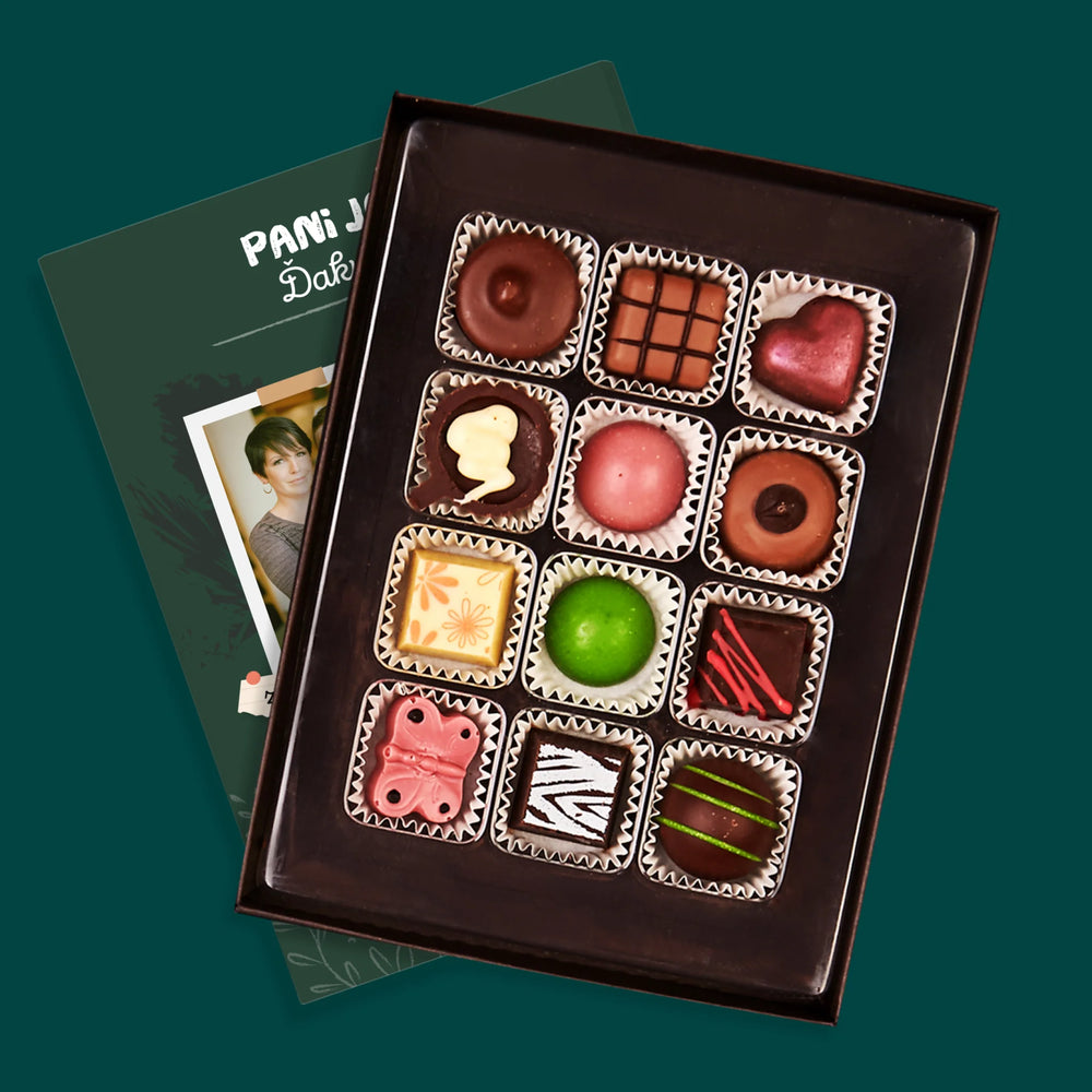 Perfektný darček pre milovníkov sladkostí! Rozmery: 20 x 15 x 3,5 cm. Počet praliniek: 12.