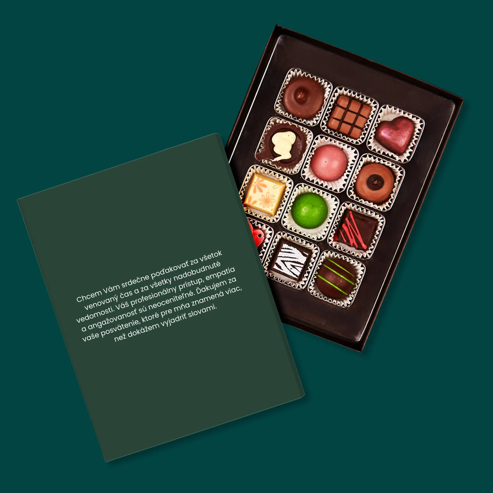 Lahodné belgické čokoládové pralinky v elegantnej krabičke s možnosťou vlastnej personalizácie.