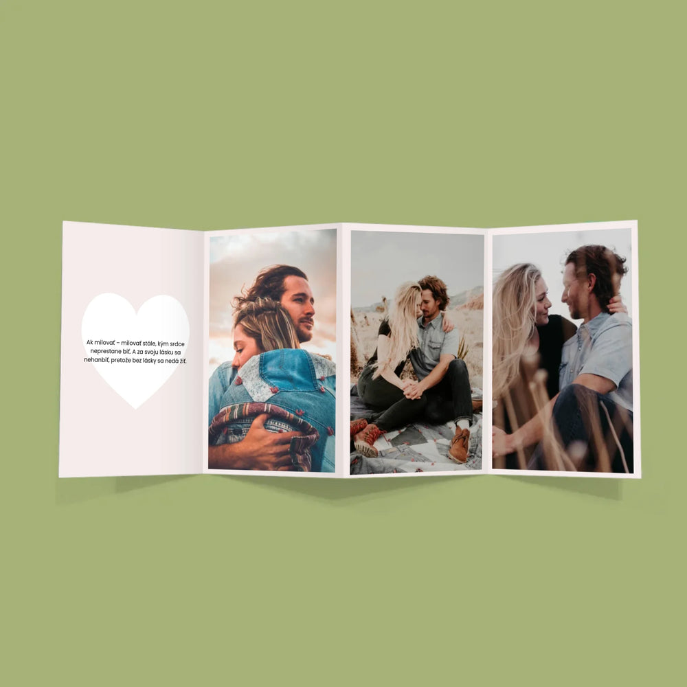 Fotografie, ktoré si vyberiete, budú vytlačené digitálnou technológiou na kvalitný papier s gramážou 300 g/m2. Harmonika sa skladá z niekoľkých fotografií (6-8 v závislosti od vzoru).