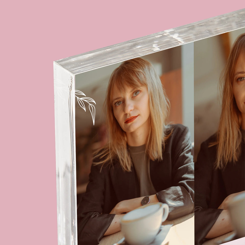 • Tlač na 2 cm hrubý, bezfarebný akrylový blok (plexisklo) s personalizovaným vzorom podľa vlastného výberu.