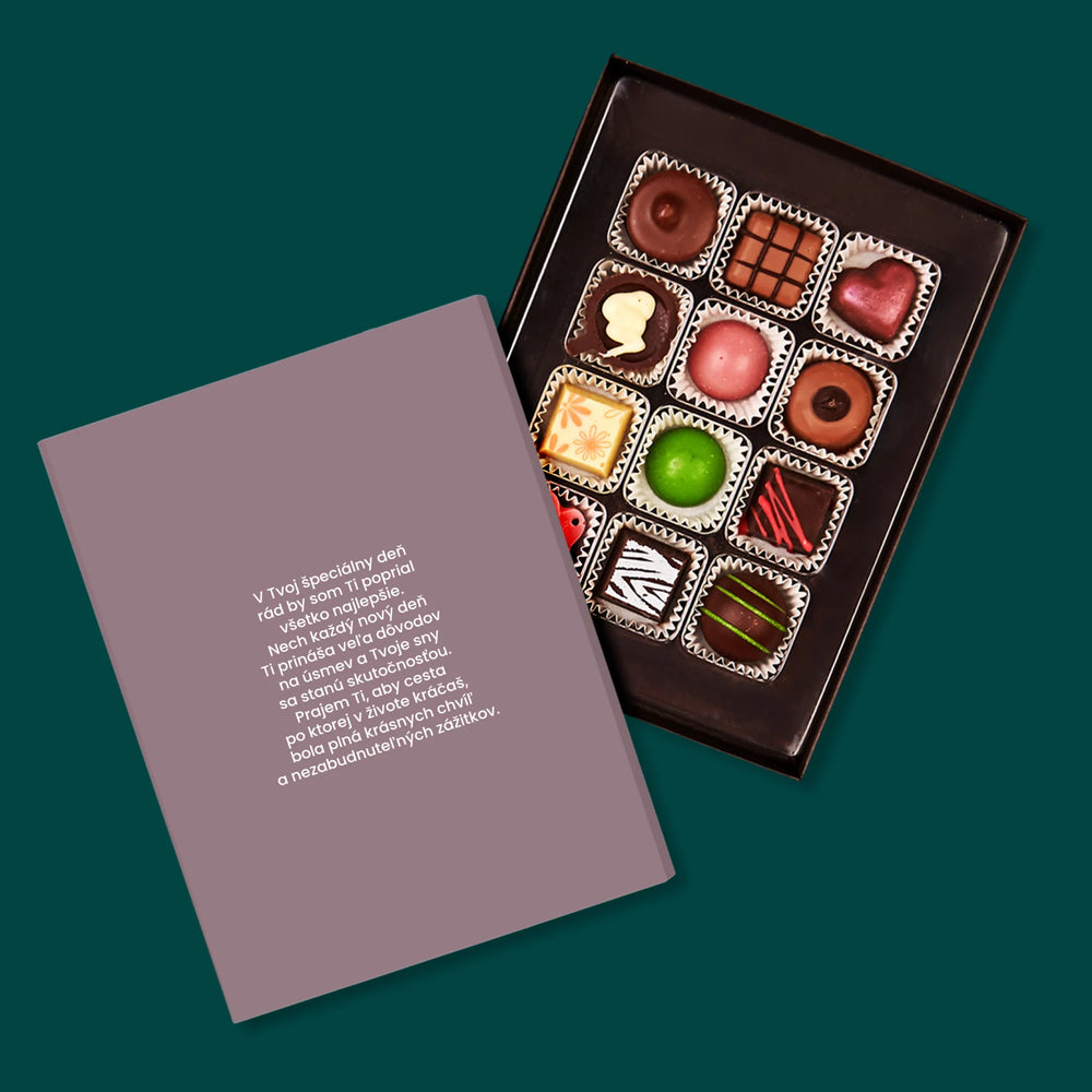 Lahodné belgické čokoládové pralinky v elegantnej krabičke s možnosťou vlastnej personalizácie.
