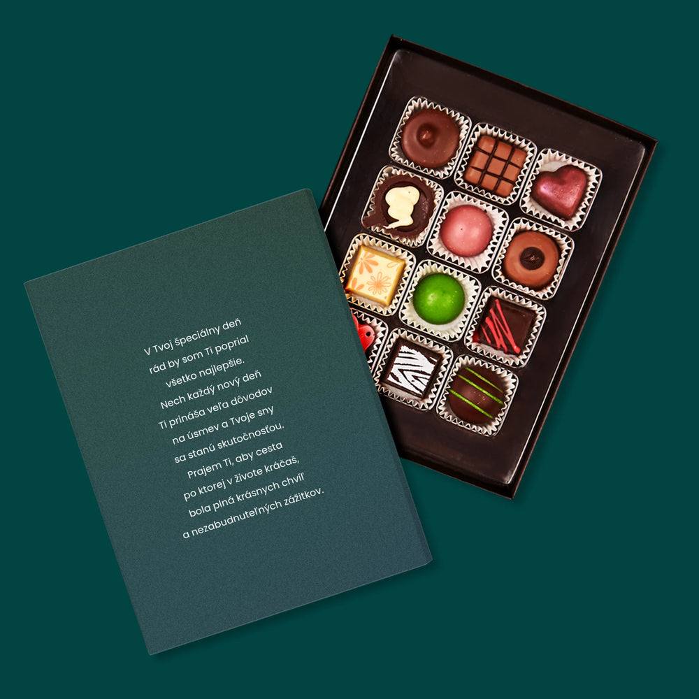 Lahodné belgické čokoládové pralinky v elegantnej krabičke s možnosťou vlastnej personalizácie.