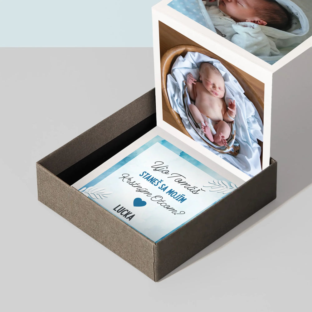 Harmonika sa skladá z troch fotografií s rozmermi 6,68 x 6,68 cm a personalizovanej karty s venovaním obdarovanej osobe.
