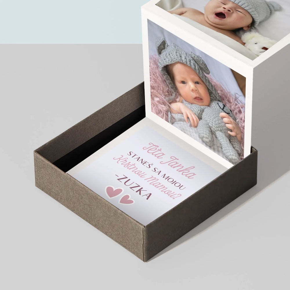 Harmonika sa skladá z troch fotografií s rozmermi 6,68 x 6,68 cm a personalizovanej karty s venovaním obdarovanej osobe.