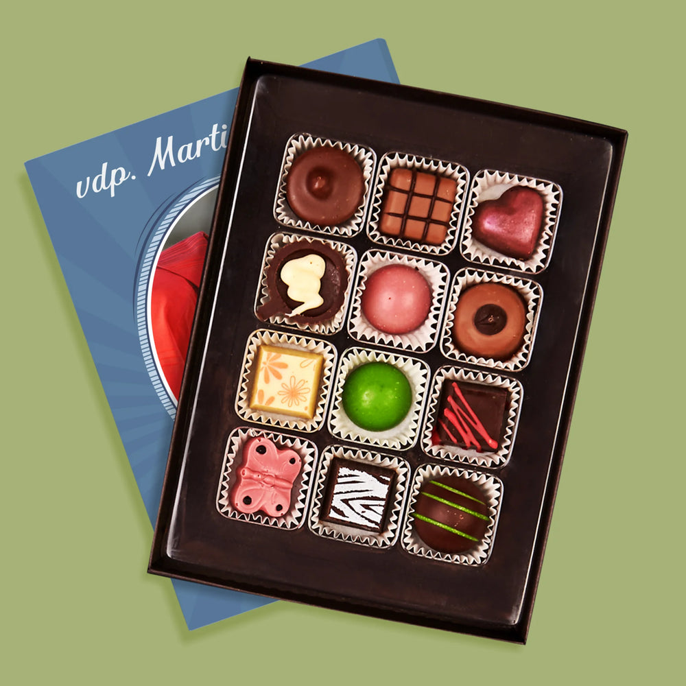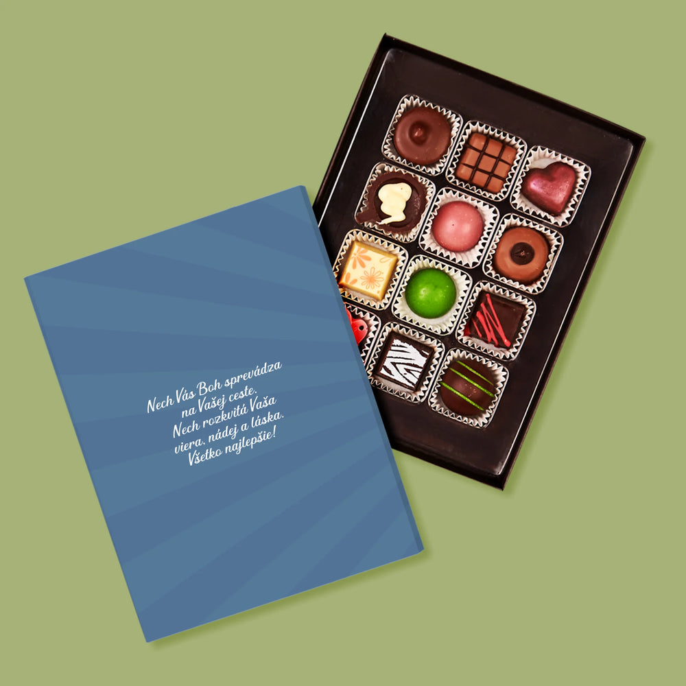 Lahodné belgické čokoládové pralinky v elegantnej krabičke s možnosťou vlastnej personalizácie.
