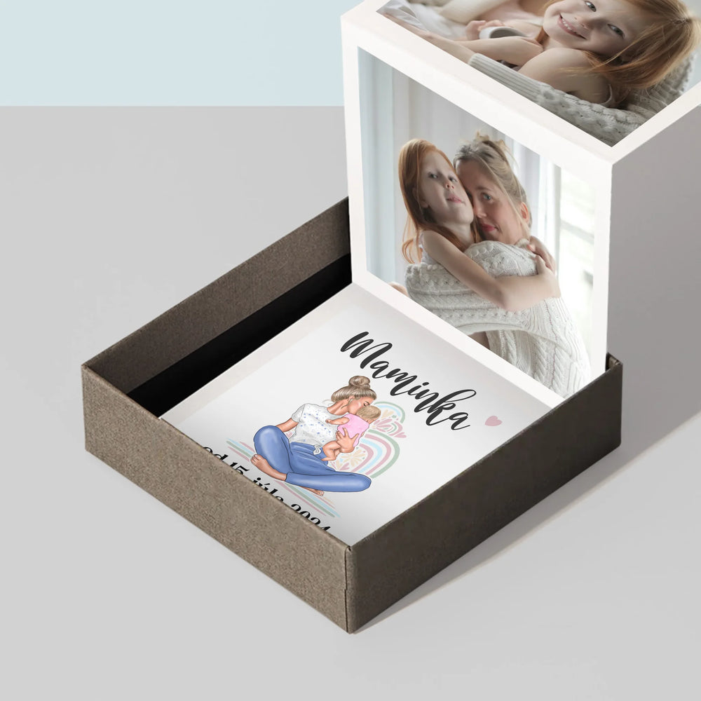 Harmonika sa skladá z troch fotografií s rozmermi 6,68 x 6,68 cm a personalizovanej karty s venovaním obdarovanej osobe.