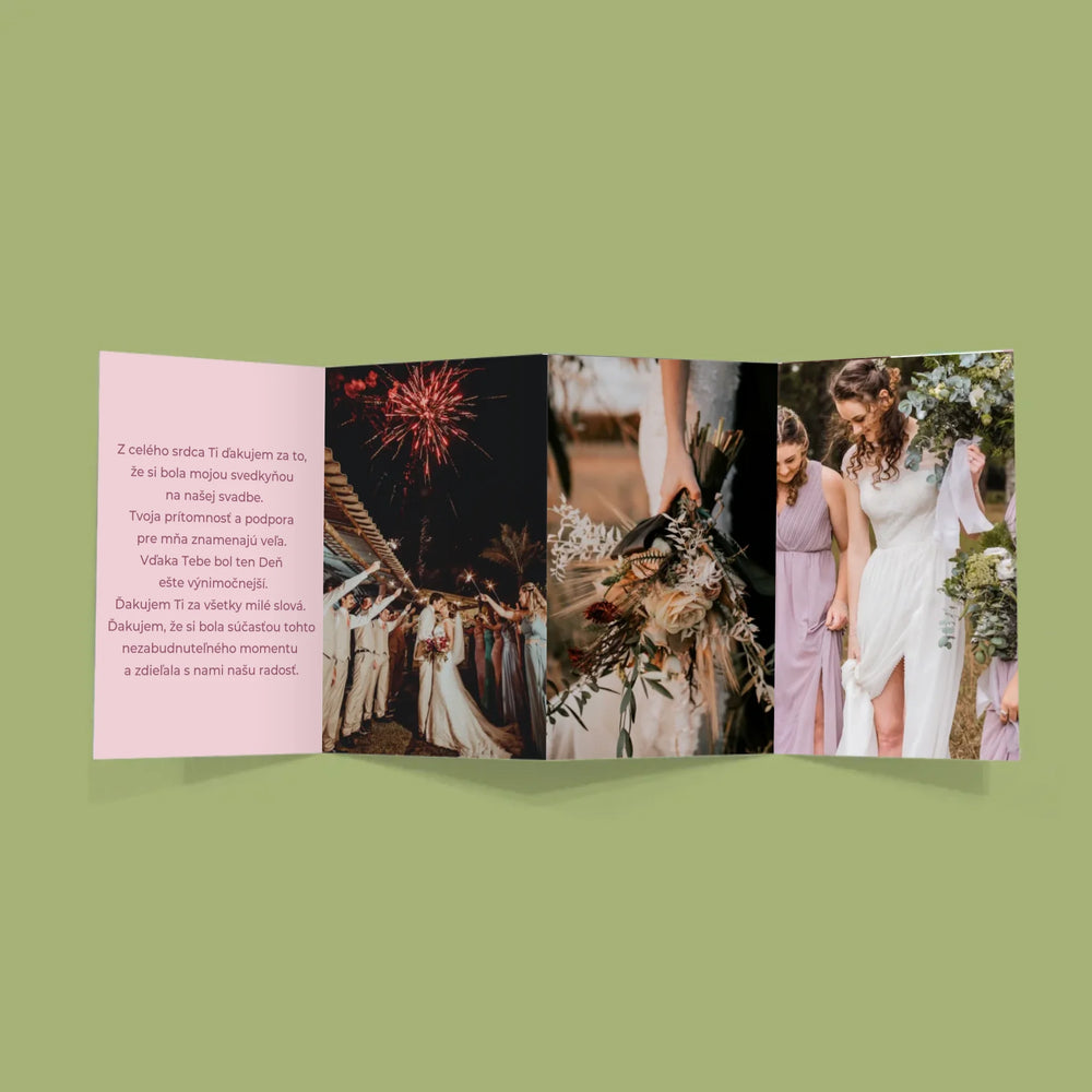 Fotografie, ktoré si vyberiete, budú vytlačené digitálnou technológiou na kvalitný papier s gramážou 300 g/m2. Harmonika sa skladá z niekoľkých fotografií (6-8 v závislosti od vzoru).